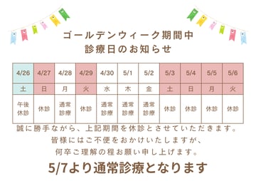 GWはカレンダー通りの診療となっております。5月3日~6日が休診となります。